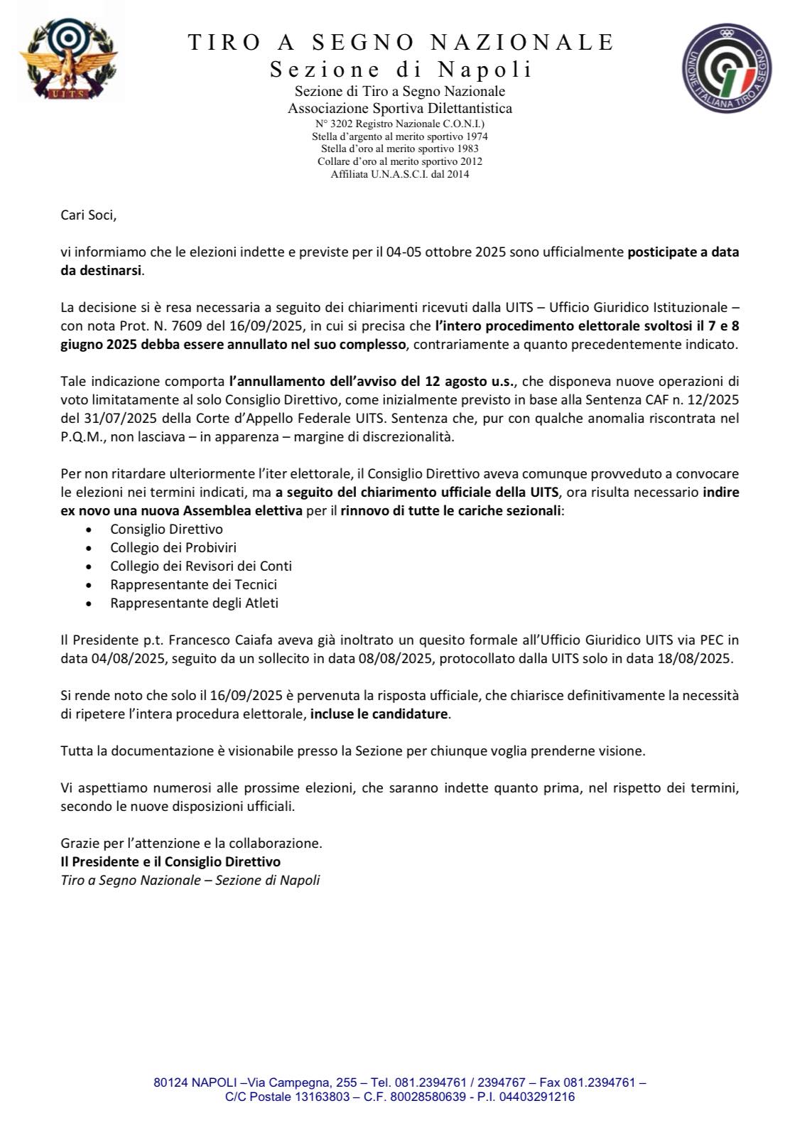 AVVISO agli iscritti soci volontari della Sezione TSN di Napoli – POSTICIPO A DATA DA DESTINARSI DELLE ELEZIONI PREVISTE PER IL 4 e 5 OTTOBRE 2025 Pubblicato il Settembre 19, 2025Settembre 19, 2025 di Gianni Cotugno Annullam_Elezioni_4-5